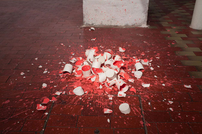 Plaster cast glasses on a shelf, filled with a coloured liquid that a programmed lever is pushing forward, until they fall down and break, splashing the paint on the floor. The viewer is faced with a decision: she or he can remain a passive observer of the activity, or she or he can stop the process. There is less than one second to decide.