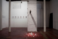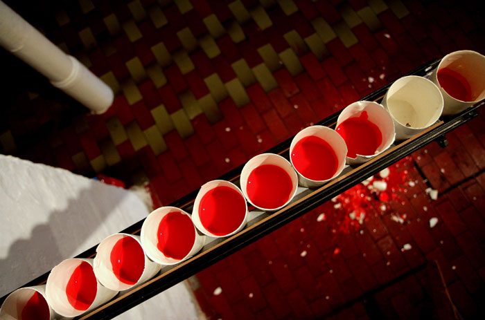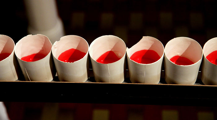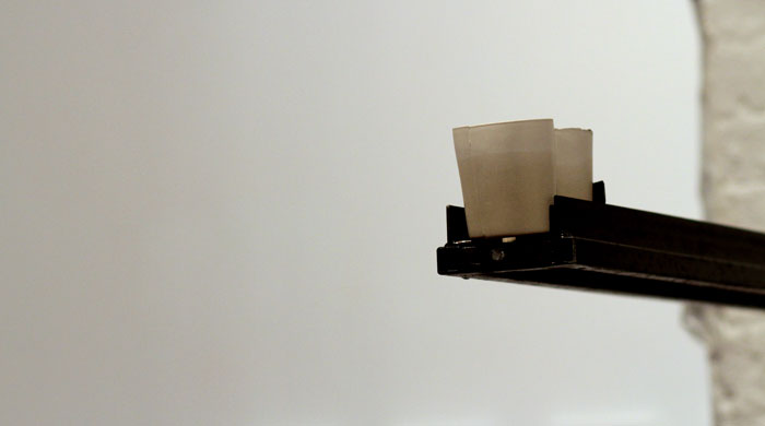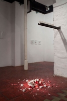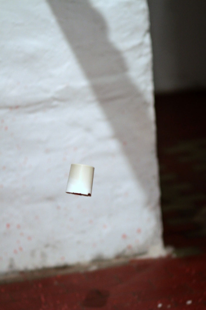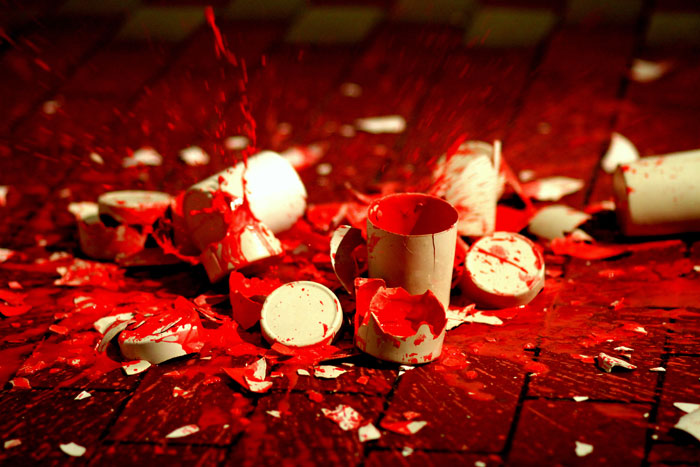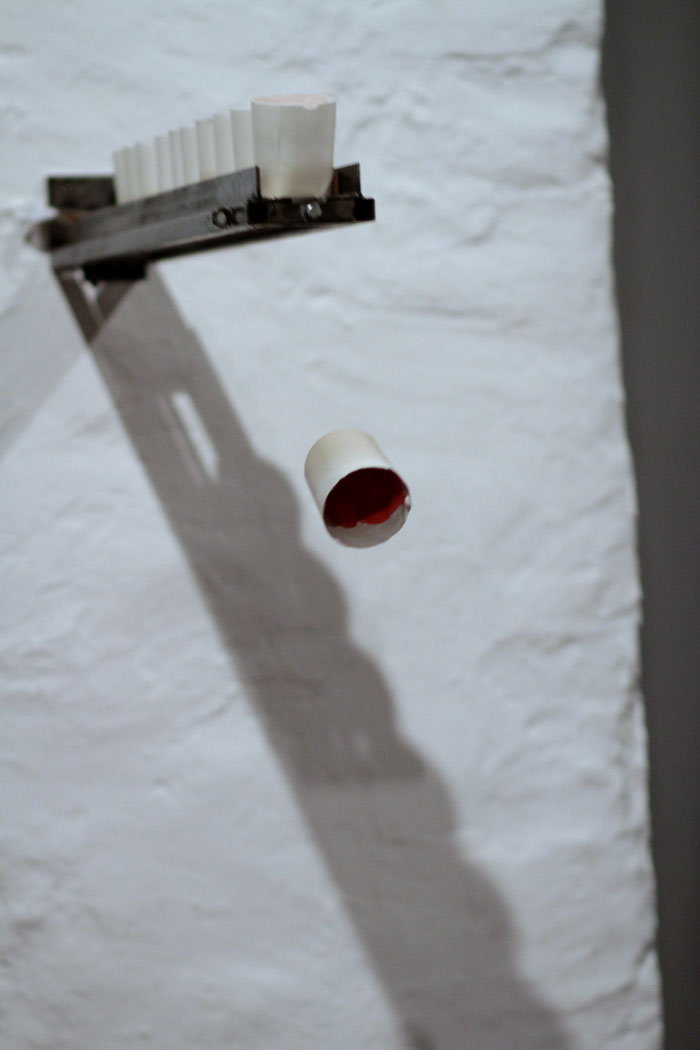 Plaster cast glasses on a shelf, filled with a coloured liquid that a programmed lever is pushing forward, until they fall down and break, splashing the paint on the floor. The viewer is faced with a decision: she or he can remain a passive observer of the activity, or she or he can stop the process. There is less than one second to decide.